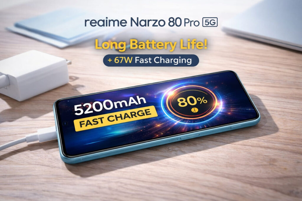 - 5200mAh рдмреЬреА battery: Realme Narzo 80 Pro 5G рдореЗрдВ 5200mAh рдХреА рджрдорджрд╛рд░ рдмреИрдЯрд░реА рджреА рдЧрдИ рд╣реИ рдЬреЛ daily usage рдХреЗ рд▓рд┐рдП рдХрд╛рдлреА reliable рд╕рд╛рдмрд┐рдд рд╣реЛрддреА рд╣реИ | рдЪрд╛рд╣реЗ рдЖрдк рд╕реЛрд╢рд▓ рдорд┐рдбрд┐рдпрд╛ рдЪрд▓рд╛рдПрдВ, рд╡реАрдбрд┐рдпреЛ рджреЗрдЦреЗрдВ рдпрд╛ рд╣рд▓реНрдХреА – рдлреБрд▓реНрдХреА gaming рдХрд░реЗрдВ – рдмреИрдЯрд░реА рдЖрд╕рд╛рдиреА рд╕реЗ рд╕рд╛рде рджреЗрддреА рд╣реИ |